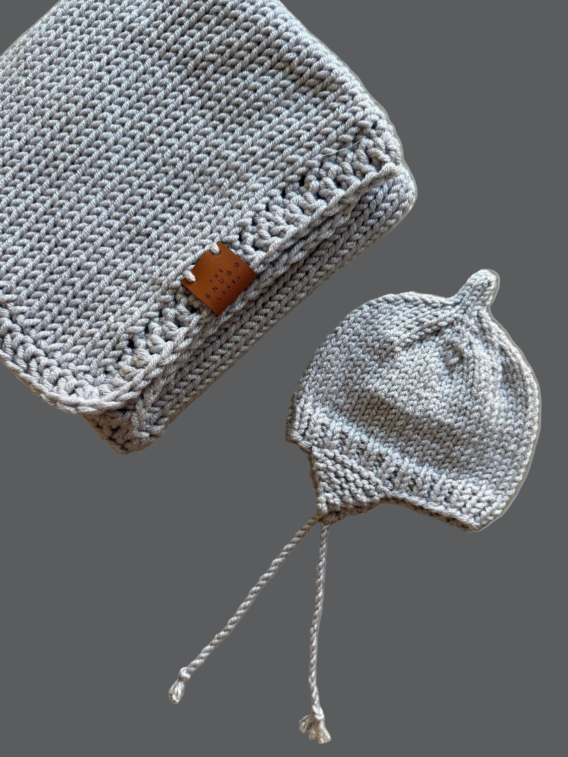 Ročno pleten komplet - siva odejica in kapica